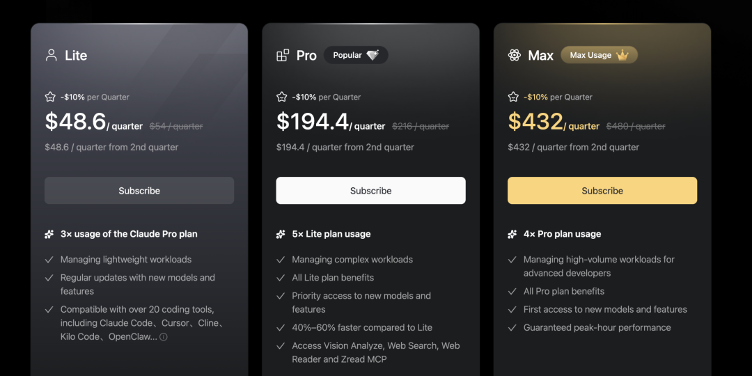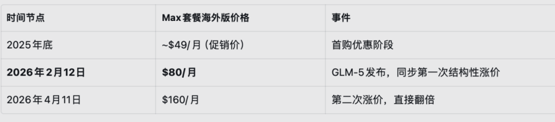 然而,在促销过后,GLM Max海外版价格快速攀升——2025年底:49美元/月(促销),2026年2月:80美元/月(+63%),2026年4月11日:160美元/月(再+100%)。相比之下,Anthropic的Claude Max 20x自推出以来 200美元/月,从未涨价。