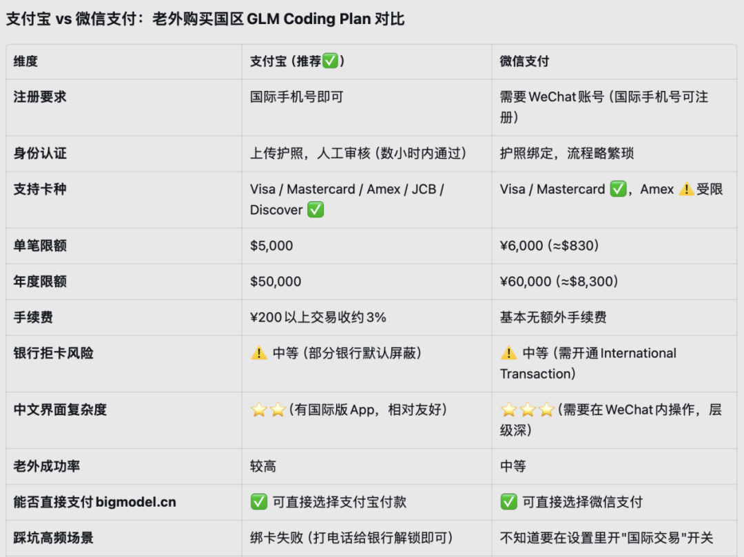 据反馈,支付宝对老外相对友好,上传护照即可完成认证,单笔限额为5000美元,年限额为50000美元(足够支付订阅费)。相比之下,微信支付的单笔限额仅6000元(约为830美元),因而对Max套餐年付足够但较紧,年限额仅60000元(约为8300美元),订阅多个月后可能触及上限,而且需要额外开启"International Transaction"(国际交易)开关,很多老外不知道这步。