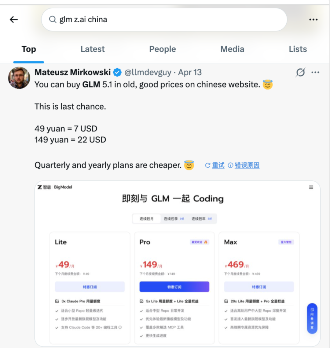 “你仍可以在中国网站,用原来的优惠价格买到GLM-5.1。”名为Mateusz Mirkowski的网友在X上表示,并获得了众多网友的留言评论。