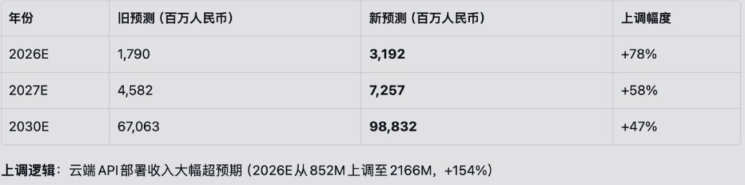 也正因如此,摩根大通在4月最新上调了目标价至950港元,较最近一次给出的目标价(800港元)上调近19%,较年初(400港元)翻倍。原因在于云端API部署收入大超预期,原本对2026年的收入预测是17.9亿元,如今则为31.92亿元,上调幅度为78%。