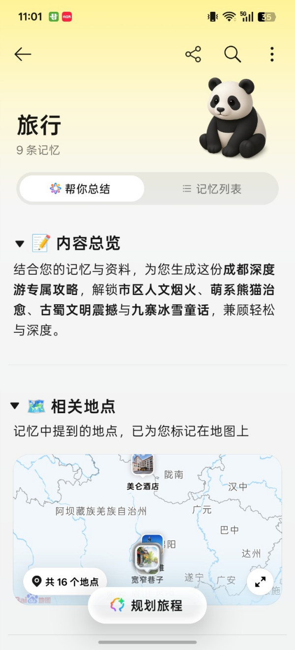 ColorOS 16主打“超流畅更AI”,除了大家关注度很高的锁屏岛,最让我觉得实用的就是小布记忆里的 AI 旅行合集功能,从信息收集、整理排版到路线规划,一步到位,让原本繁琐的准备工作,变得轻松又清晰。