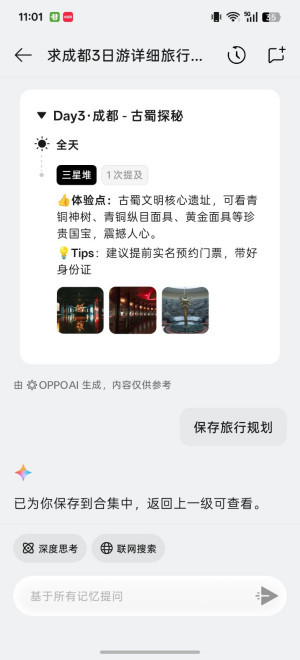 在 ColorOS 16 上这一步被大幅简化。不管你在哪个平台看到想去的目的地、好玩的景点或者实用的旅行建议,只需要按一下机身左侧的一键闪记,系统就会自动抓取关键内容,把文字、图片、地点信息统一收录到小布记忆里。整个过程不用手动操作,不用打断当前浏览,看到有用的内容记一下就行,非常省心。不过这些零散的内容不会一直杂乱地堆在一起,小布会通过 AI 自动梳理,把所有信息整合起来,形成一篇结构完整的旅行合集。