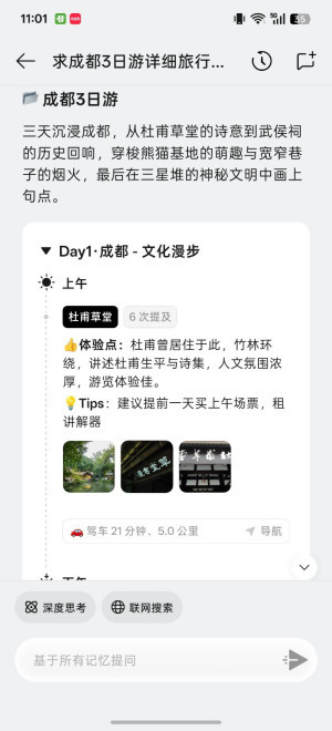 不用你自己排序、不用你分类归纳,系统会按照行程逻辑重新组织内容,哪些是景点、哪些是美食、路线怎么走、顺序如何安排,全部帮你梳理清楚。从原来通用、零散的攻略,直接变成了可以照着走的路书级方案,拿到手就能用,真正实现“闭眼跟玩”。